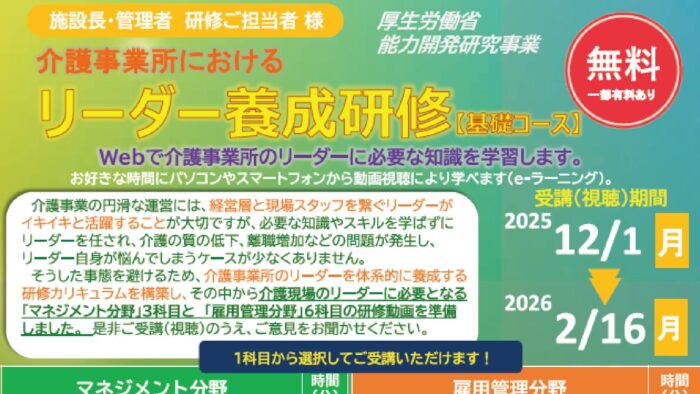 介護労働安定センターの「介護事業所におけるリーダー養成研修」が、好きな時間に受講できるEラーニング形式で開始されましたのでご案内します(受講可能期間:2025/12/1~2026/2/16)。