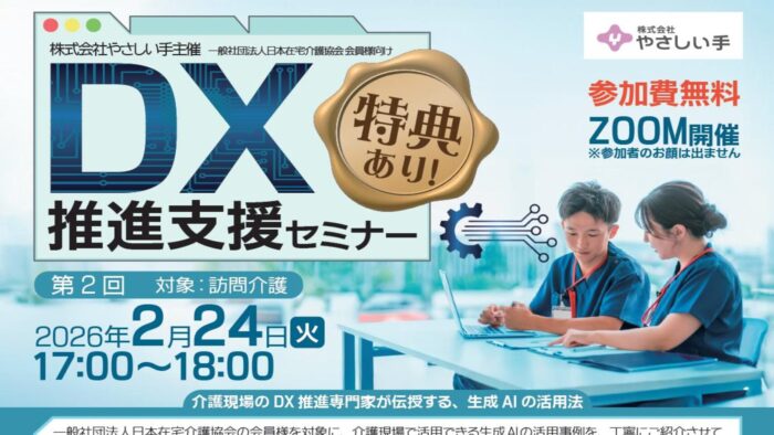 会員企業の株式会社やさしい手による「DX推進セミナー」第2回(対象:訪問介護)をご案内します。会員限定特典として、同社「むすぼなAI」の無償トライアル利用権が付いています。(2/24、WEB開催)